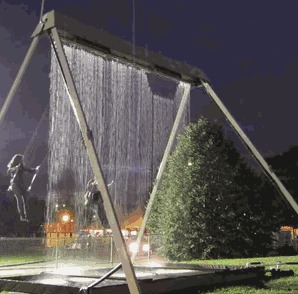 水帘秋千:使用轻便、坚固的材质,具有良好的控制功能和简单的框架结构。当人们坐在秋千上摆动时,会触发感应装置,使水帘随之变化,营造出独特的互动体验,适合安装在商场、景点等场所。